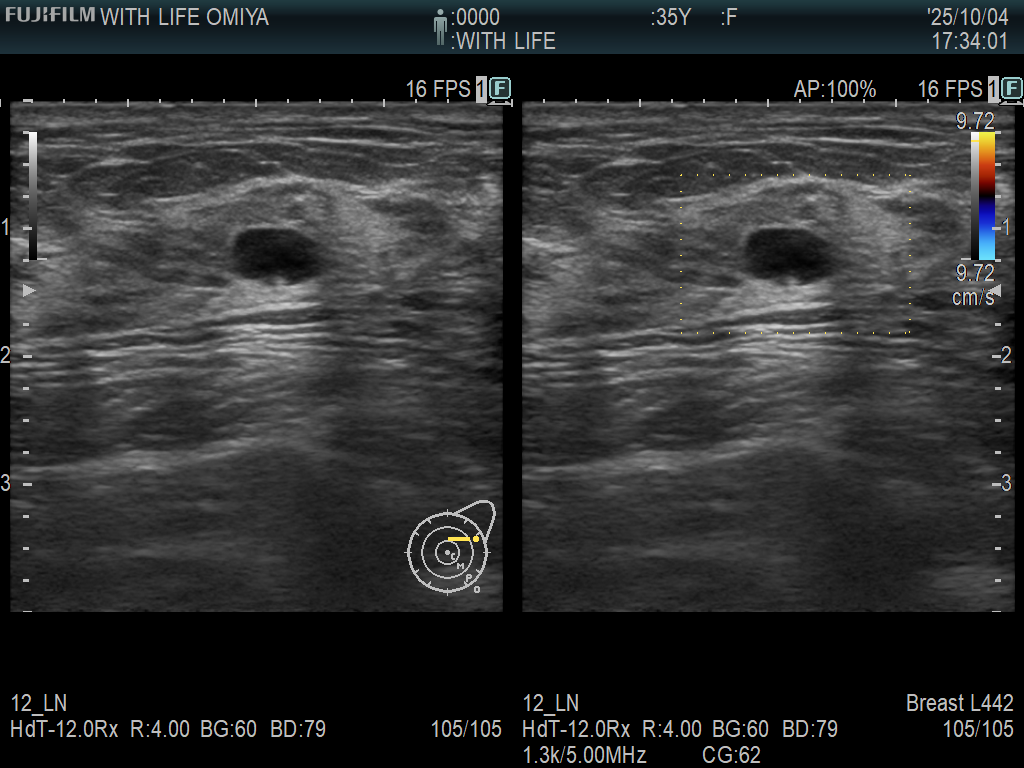 当院では最新の 3Dマンモグラフィ(トモシンセシス) を導入しており、従来のマンモグラフィ画像(2D)に比べて乳腺の重なりを分離して表示できるため、小さな病変や見えにくい部分も評価しやすくなります。(左が3D, 右が2D)