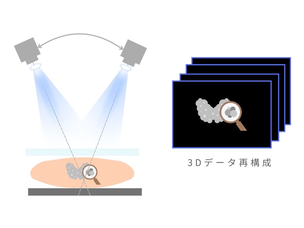 薄い断層画像を重ねて立体的な画像を作る方法です。乳腺の重なりによる見えづらさが低減されるので、小さな病変や腫瘤も発見しやすいです。2Dと比べて精度が高いので、見落としや再検査を低減できるメリットがあります。