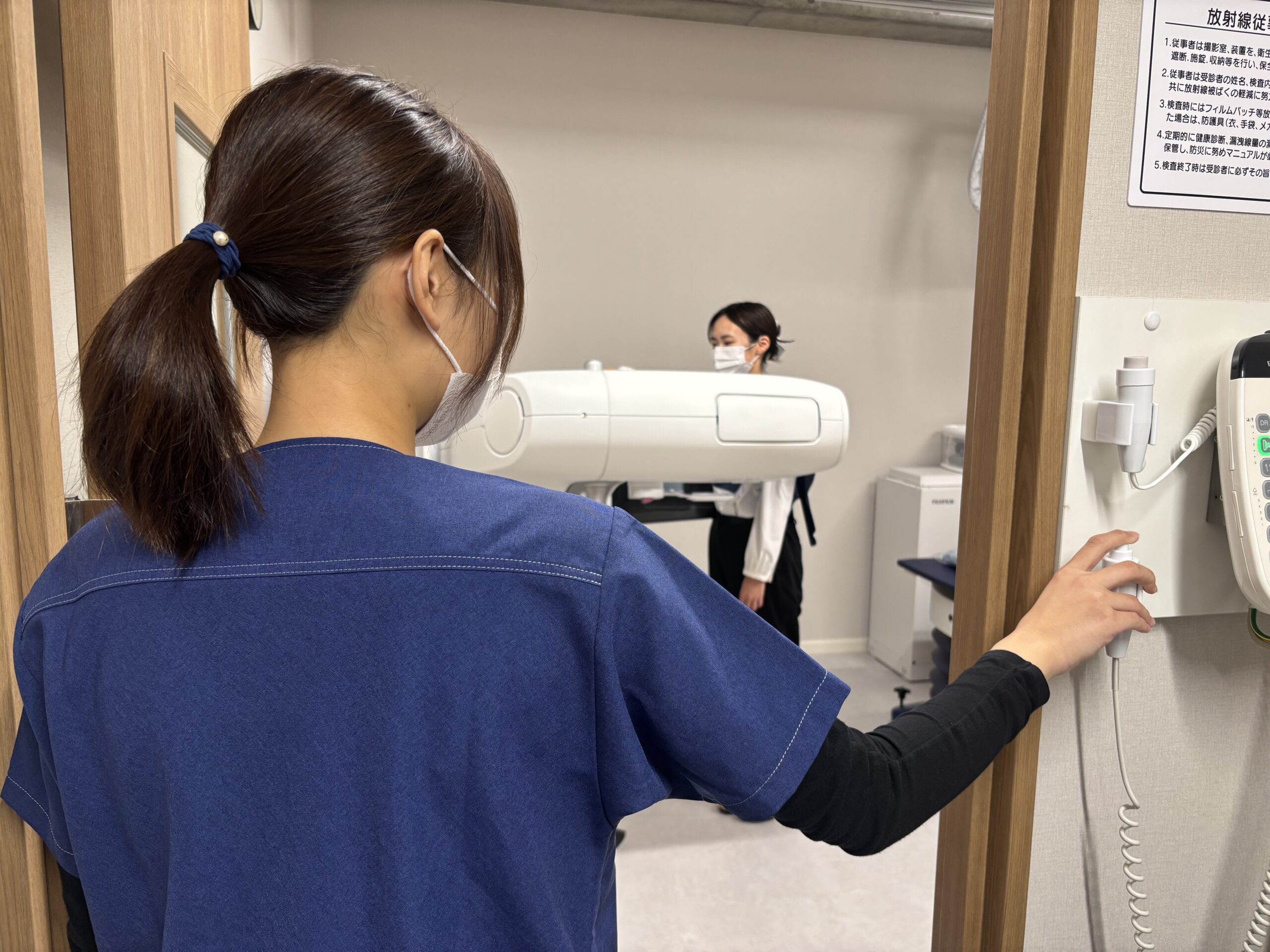 放射線技師が、乳房の位置や機器の角度を調整し、最もきれいに撮影できる姿勢を整えさせていただきます。髪が長い方は結んでいただくようにお願いしています。(髪留めはご用意しています)
