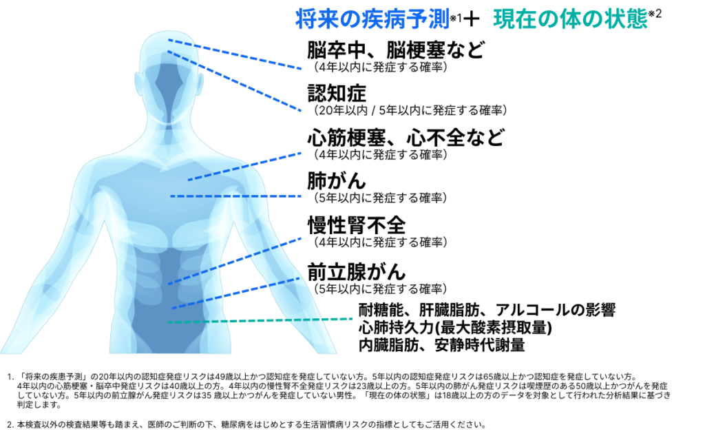 1回の採血で、以下の「将来の疾病予測」と「現在の体の状態」をまとめて知ることができます。